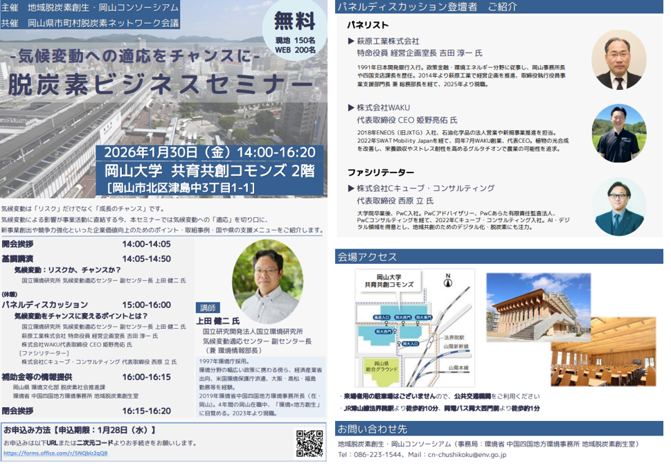 『地域脱炭素創生・岡山コンソーシアム』 脱炭素ビジネスセミナー(1/30開催、1/28締切・岡山+オンライン)