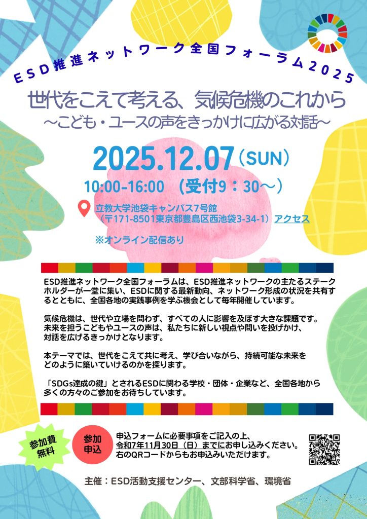 ESD 推進ネットワーク全国フォーラム 2025 世代をこえて考える、気候危機のこれから~こども・ユースの声をきっかけに広がる対話~の開催について(12/7開催、11/30締切・東京+オンライン)