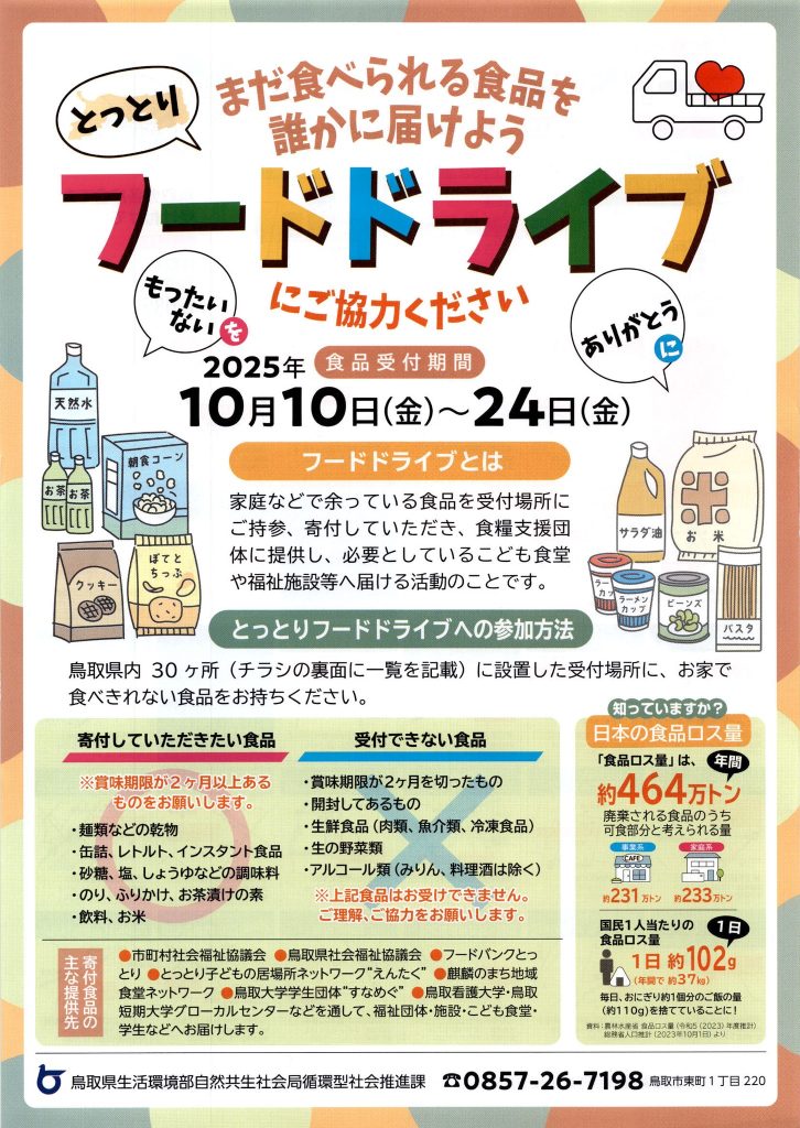 令和7年度も、10月と1月で『とっとりフードドライブ』を実施します。ご提供いただいた食品は必要とされる方へ提供しますので、皆様のご協力をお願いいたします。