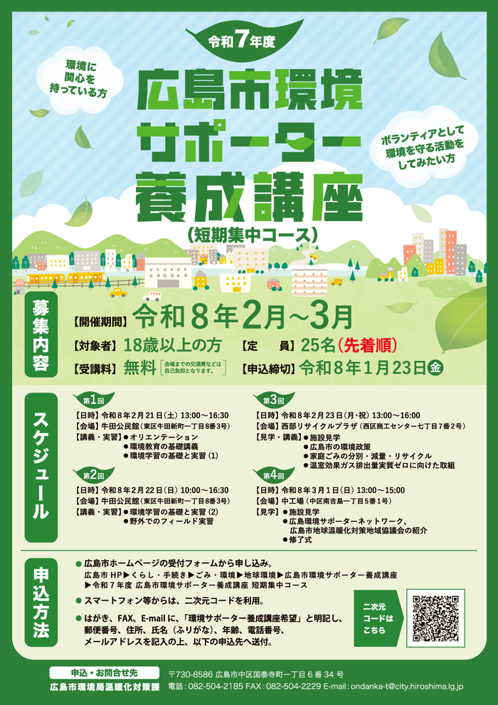 令和7年度 広島市環境サポーター養成講座(短期集中コース)(2/21から開催、1/23締切・広島)