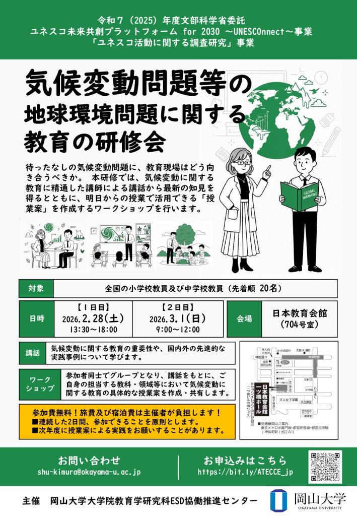 令和7年度 文部科学省委託ユネスコ未来共創プラットフォーム for 2030 ~UNESCOnnect~事業による「ユネスコ活動に関する調査研究」事業 気候変動問題等の地球環境問題に関する教育の研修会(R8.2/28,3/1開催・岡山)