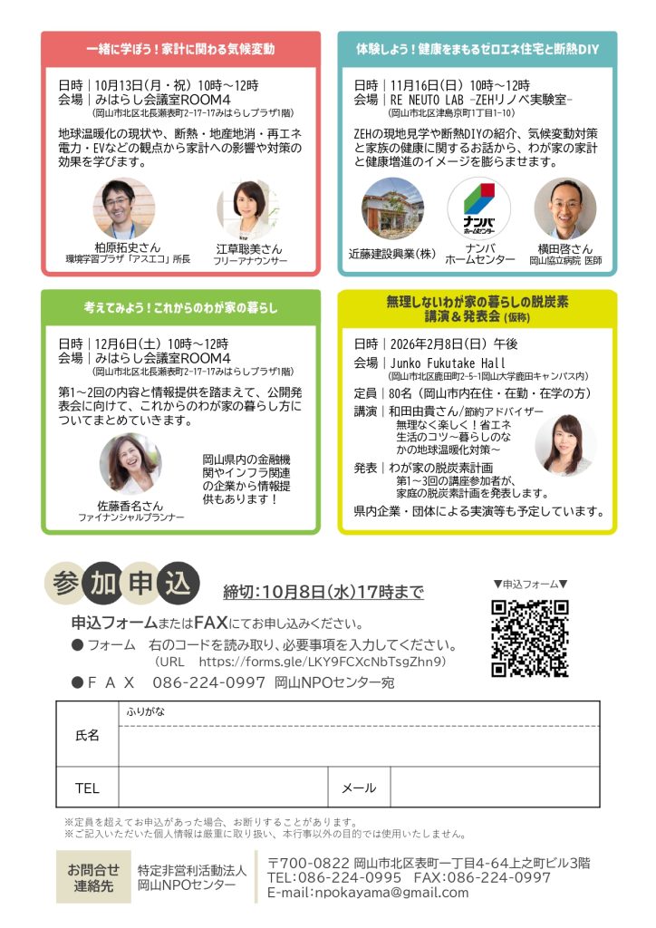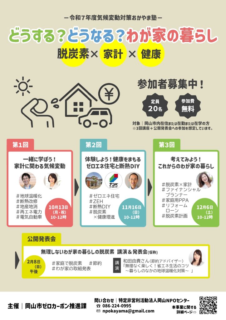 気候変動対策おかやま塾 どうする?どうなる?わが家の暮らし -脱炭素×家計×健康-(10/13,11/16,12/6開催、10/8締切・岡山)