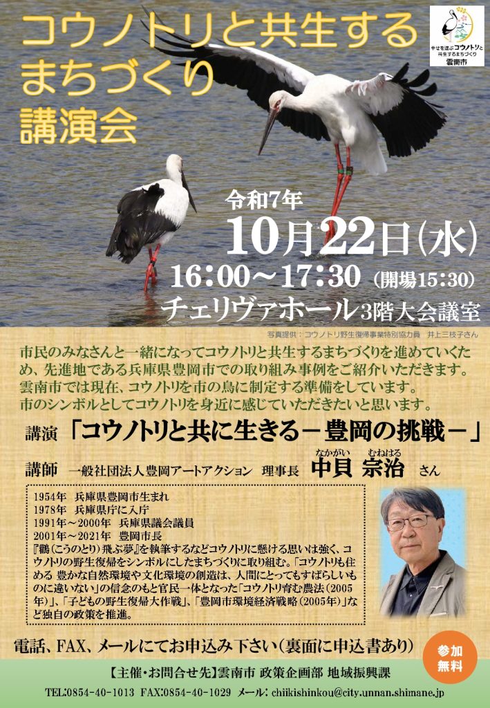 コウノトリと共生するまちづくり講演会(10/22開催、10/20締切・島根)