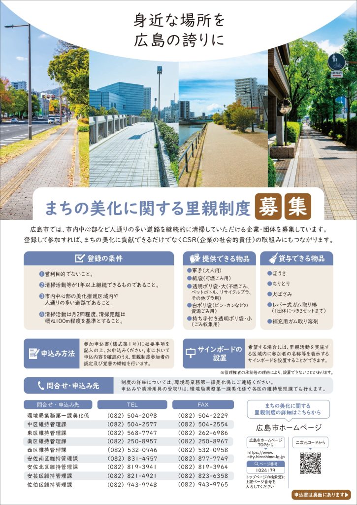 広島市では、市内中心部など人通りの多い道路を継続的に清掃活動する企業・団体を募集しています。参加者として登録のうえ、清掃活動をしてみませんか?