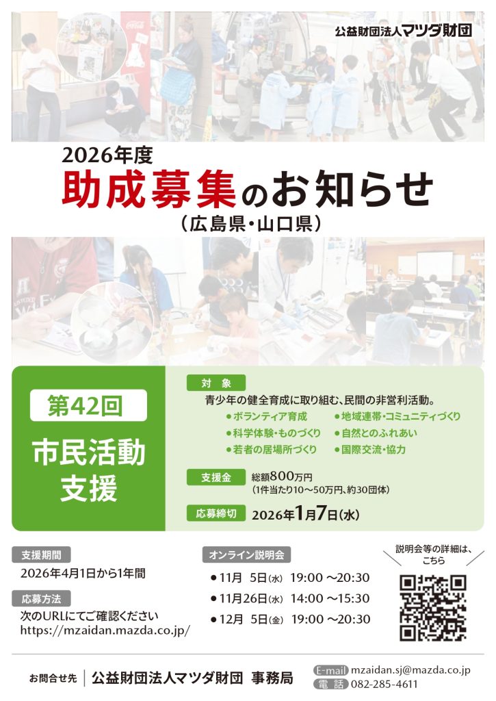 マツダ財団は、次代を担う青少年が心豊かに成長することを願っています。そのため、彼らがいろいろなことに興味を持ち、多くの感動を得ることのできる生活体験機会の提供や、地域社会のコミュニティづくりに参加する機会の提供等に尽力されている非営利の市民団体による諸々の活動を支援しています。当支援は、1984年の設立より実施しており、2026年に42回目を迎えます。