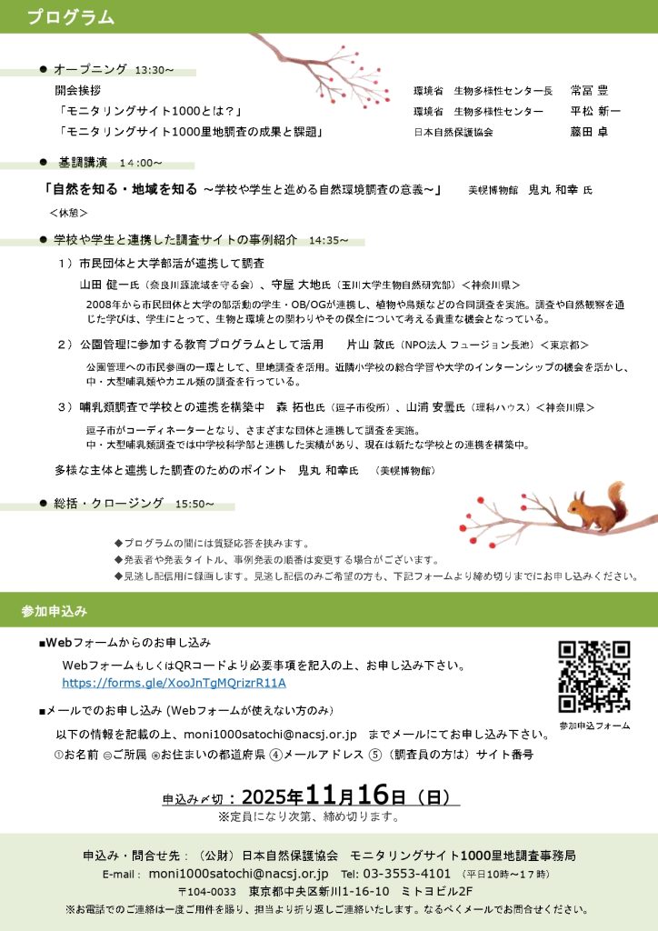 モニタリングサイト1000里地調査 2025年度シンポジウム「里地調査を通した次世代の自然の守り手育成~学校や学生との連携を事例に~」(11/22開催、11/16締切・全国)