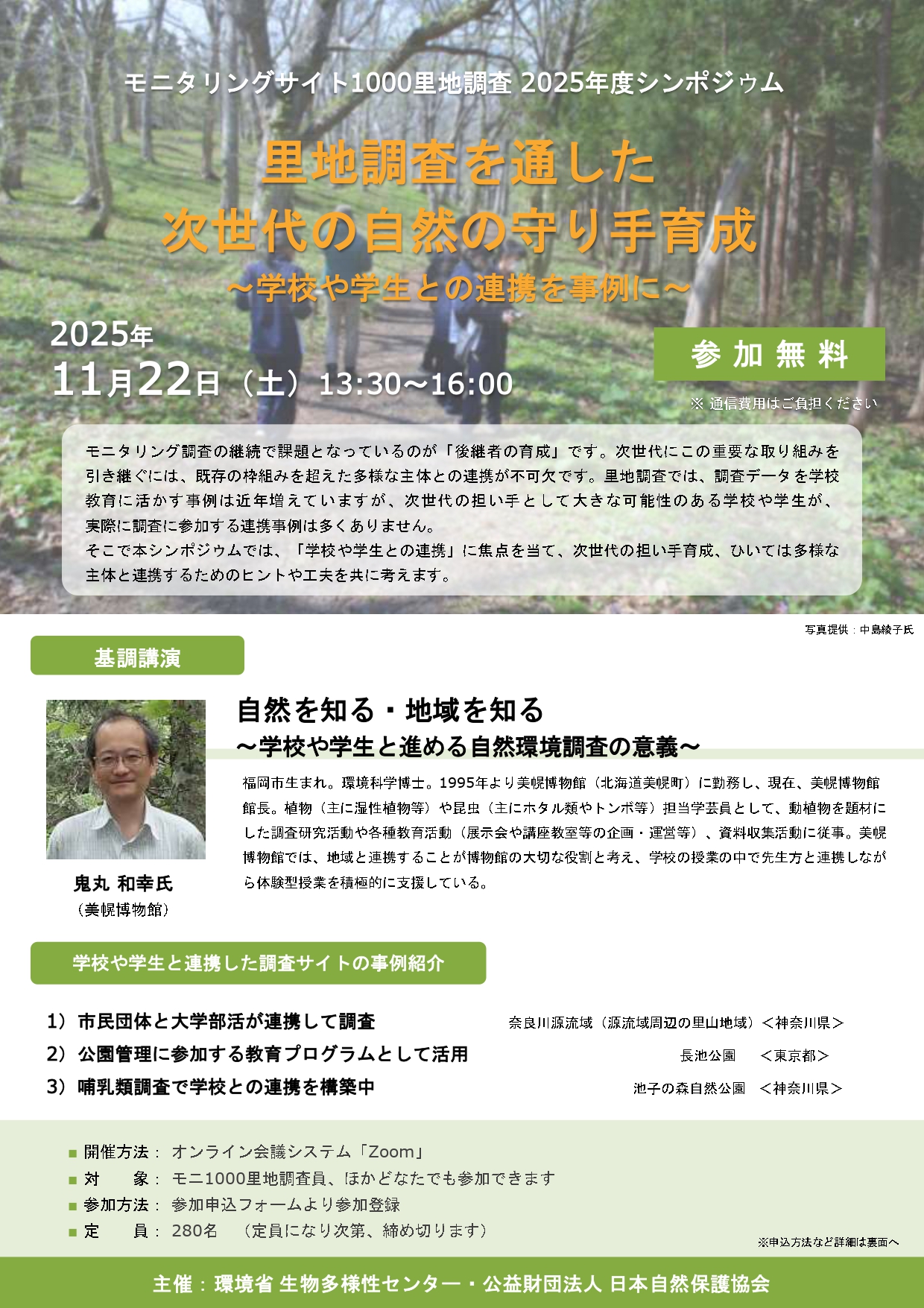 モニタリングサイト1000里地調査 2025年度シンポジウム「里地調査を通した次世代の自然の守り手育成~学校や学生との連携を事例に~」(11/22開催、11/16締切・全国)