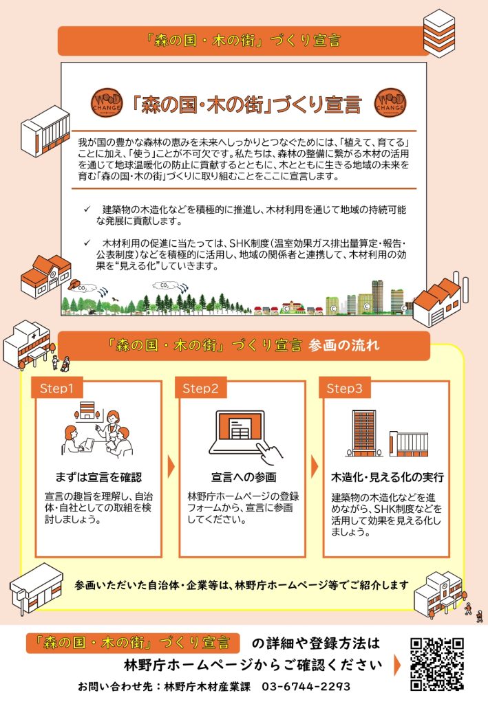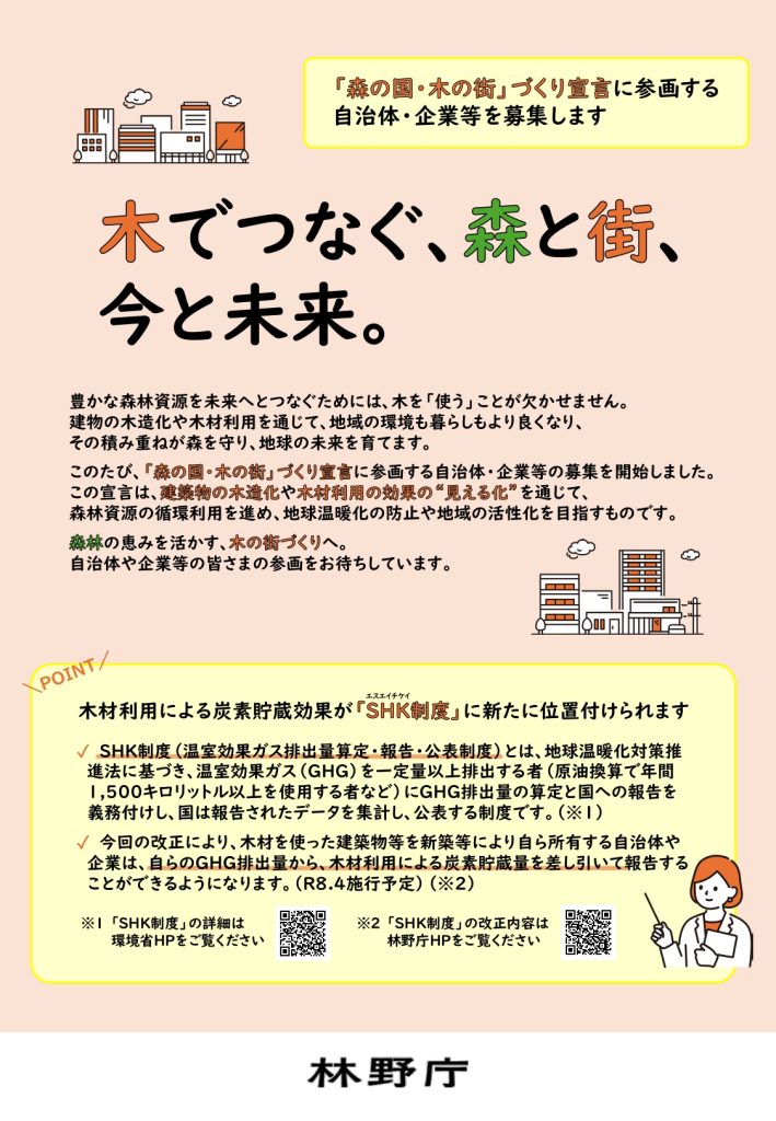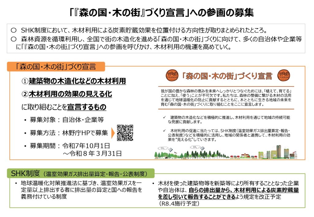 これを契機に、令和7年10月1日より、自治体や企業等の皆さまが、建築物の木造化などの木材利用の推進や、木材利用の効果の見える化に取り組むことを宣言する「『森の国・木の街』づくり宣言」の募集を開始します。皆様の積極的な参画をお待ちしています。