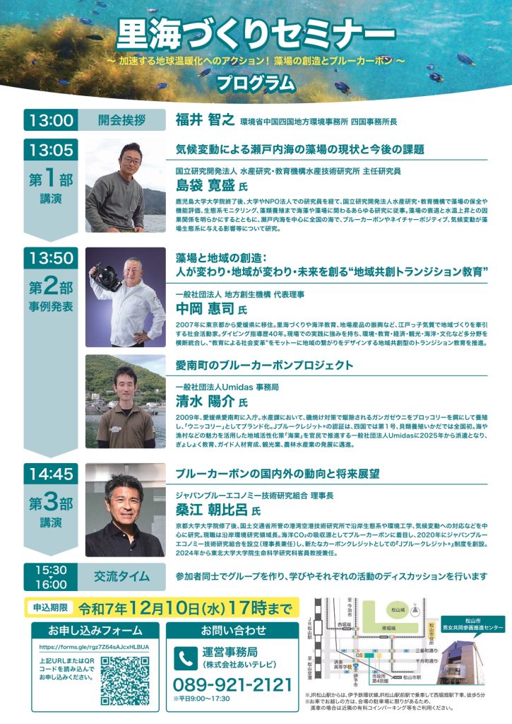 令和7年度里海づくりセミナー~ 加速する地球温暖化へのアクション!藻場の創造とブルーカーボン~(12/17開催、12/10締切・愛媛)