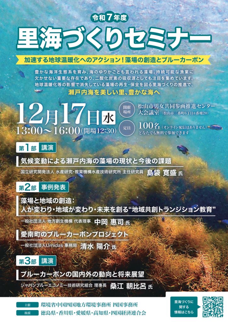 環境省中国四国地方環境事務所四国事務所では、地球温暖化に伴う水温上昇等によって藻場の衰退・消失が進んでいる中、「加速する地球温暖化へのアクション!藻場の創造とブルーカーボン」と題し、水産資源や生物多様性豊かな海づくりと地球温暖化対策への貢献に向けて、藻場の保全・再生・創出の活動が活発化し、藻場の拡大を図ることを目的に、別添のチラシのとおり12月17日(水)に松山市において「令和7年度里海づくりセミナー」を開催いたします。