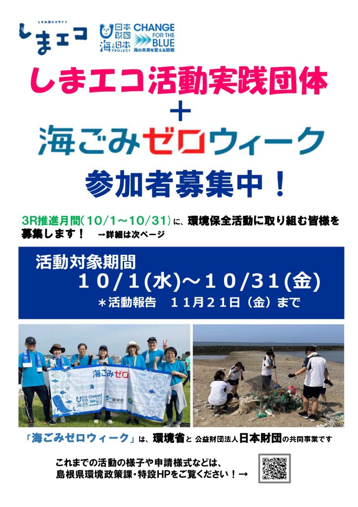 島根県では、県内の企業や団体等を対象として、環境保全活動に取り組む「しまエコ活動実践団体」を募集しています。