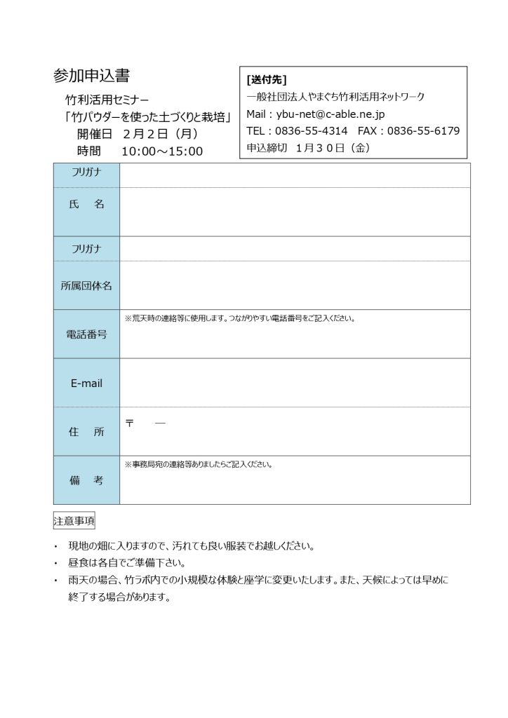 一般社団法人 やまぐち竹利活用ネットワークまで、電話、FAX、メールのいずれかでお申し込みください。