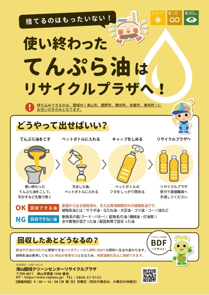 使い終わったてんぷら油はリサイクルプラザへ!(津山市、鏡野町、勝央町、奈義町、美咲町 お住いの方対象)