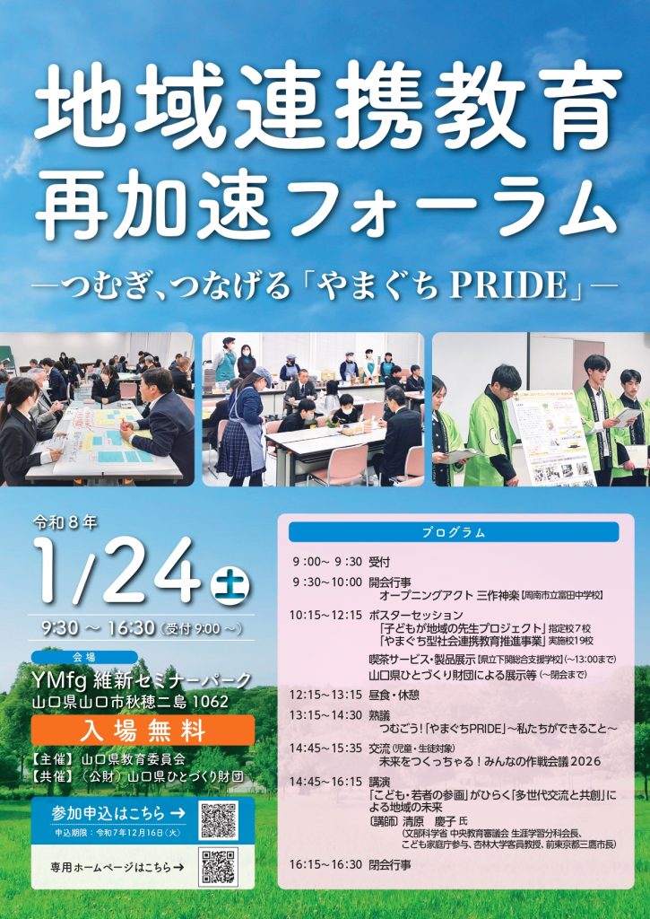令和7年度地域連携教育再加速フォーラム -つむぎ、つなげる「やまぐちP R I D E」-(1/24開催、12/16締切・山口)
