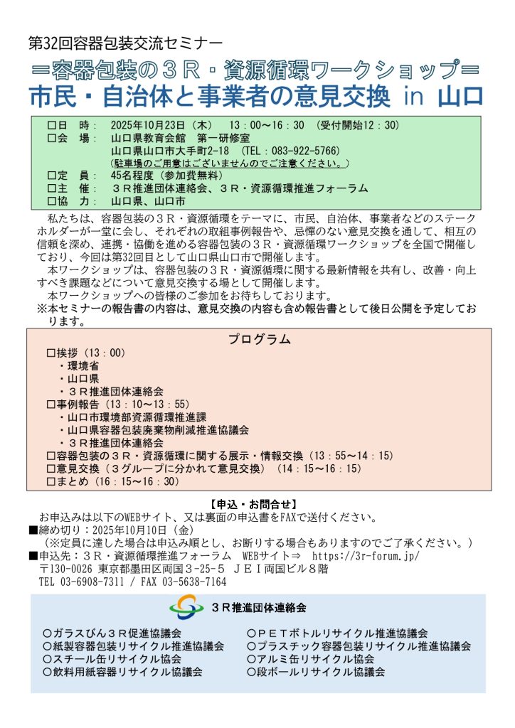 第32回 容器包装交流セミナー ー容器包装の3R・資源循環ワークショップー 市民・自治体と事業者の意見交換 in 山口(10/23開催、10/10締切・山口)